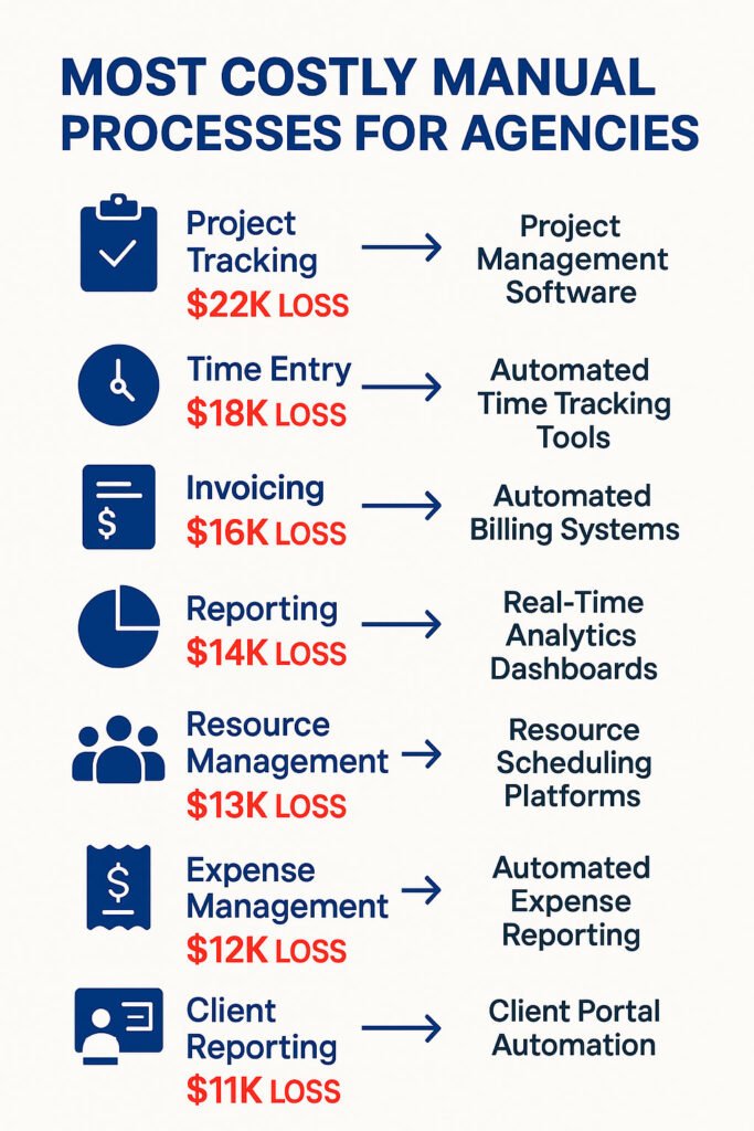 Let’s break down the seven biggest time and money drains in most agencies—and how to fix them with automation: