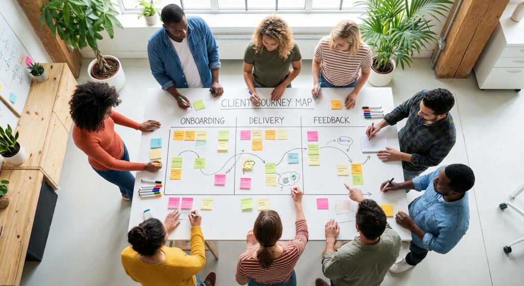 From onboarding to delivery to feedback, list every client touchpoint. Where do things get stuck? Where do clients get confused? Map these pain points to portal features.